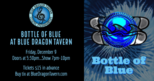 Doors at 5:30pm…show 7pm-10pm. Tickets are $15 in advance…children 12 and under are free. Purchase tickets at https://www.simpletix.com/e/bottle-of-blue-at-blue-dragon-tavern-ticke-tickets-120428