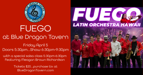 This dynamic Orchestra is ready to vibrate energetically and generate an unforgettable night for everyone, together with El Ritmo, El Sabor y toda La Candela of our beloved Latin music. Fuego Latin Orchestra Hawaii is bringing the heat to this incredible location. Get ready to dance the night away to the infectious sounds of salsa, cumbia, bachata, merengue and more! Boasting a BIG DANCE FLOOR, indoor-outdoor seating, food, drink, and AMAZING MUSIC by the Big Island’s Hottest Latin group!