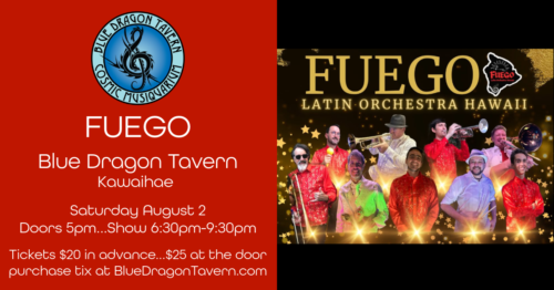 $20This dynamic Orchestra is ready to vibrate energetically and generate an unforgettable night for everyone, together with El Ritmo, El Sabor y toda La Candela of our beloved Latin music. Fuego Latin Orchestra Hawaii is bringing the heat to this incredible location. Get ready to dance the night away to the infectious sounds of salsa, cumbia, bachata, merengue and more! Boasting a BIG DANCE FLOOR, open air seating, food, drink, and AMAZING MUSIC by the Big Island’s Hottest Latin group!