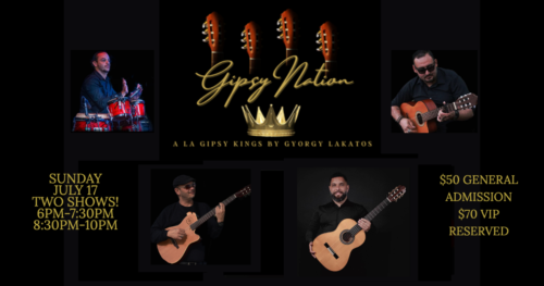 Gipsy Nation A La Gipsy Kings is lead by Gyorgy Lakatos. Born in Budapest, Hungary, he grew up surrounded by talent. Rooted in Hungarian gypsy music through his grandfather, father, and uncle all from the Lakatos dynasty, internationally known as famous violinist virtuosos, and musicians who have contributed to the preservation of gypsy music and traditions. Lakatos is a world-renowned guitarist who re-defines the art of guitar playing in every one of his concerts. He is an innovator, a one of kind performer with extraordinary talent, with charisma and contagious energy. He is a songwriter, performer and a “Gypsy Heart” romancing any audience with his suave approach to making the guitar sing like an angel. He has traveled throughout the world entertaining many audiences…His agile hands caress the strings of the guitar in a manner never before seen, performing as if it was a part of his body. He redefines music with his supernatural talent. Gyorgy’s family members are all musicians, most known world wide, and he carries a tradition passed down through generations. When asked about his music he has only one thing to say. “It’s the air that I breathe, without it, I can’t exist.” He is simply an amazing Artist.