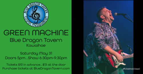 Green Machine is the ultimate good time party band based out of Kona…blending classic rock , funk , soul, pop and country…covering artists like Zeppelin, the Stones, War, and more! Featuring the Always Rippin’ David Lawrence on guitar/vocals..