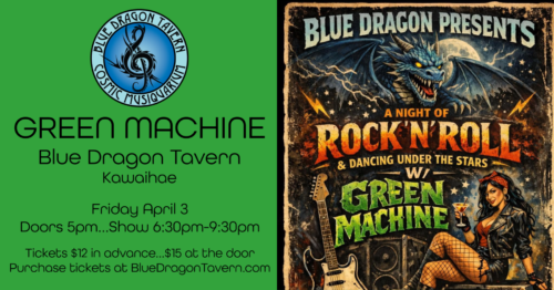 Green Machine is the ultimate good time party band based out of Kona…blending classic rock , funk , soul, pop and country…covering artists like Zeppelin, the Stones, War, and more! Featuring the Always Rippin’ David Lawrence on guitar/vocals..