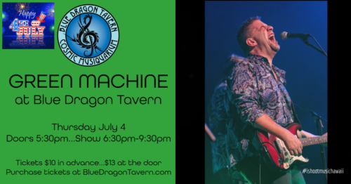Celebrate the 4th of July with Green Machine! Green Machine is the ultimate good time party band based out of Kona…blending classic rock , funk , soul, pop and country…covering artists like Zeppelin, the Stones, War, and more! Featuring the Always Rippin’ David Lawrence on guitar/vocals, Jason Sherbundy on keys, Dave Ojeda on bass, and Felix Guerra on drums.