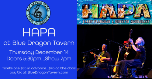 HAPA returns to the Blue Dragon for what is sure to be another memorable evening of music.. The Big Island duo of Bad Papa will be the supporting act. Doors at 5:30pm…Show 6pm-9pm. Purchase tickets here.