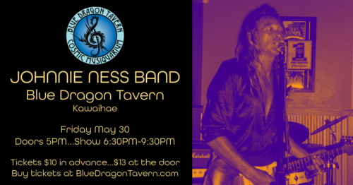 Johnnie Ness and his band rocks the Blue Dragon Tavern. Johnnie is a dynamic entertainer and guitarist from the Hilo side….playing a mix of rock and funk with tunes from Santana, SRV, CCR, Red Hot Chili Peppers and more! With Eric Avery on bass and Jeremy Smith on drums.
