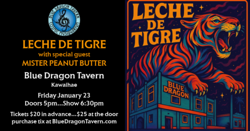 The bands sound relies on percussive grooves the melodic impact of the acoustic guitar and the eloquent and soulful vocal and musical formula that connects and evolves spontaneously engaging every audience. Standard Rock band backline fused with Spanish, Cuban and South American instruments along with Trumpet complement both male and female multilingual lyricists. Nylon String, Acoustic steel string Guitar, Cuban Tres, Drums, Bass, Congas & Bongos, Trumpet and Vocals compose the group, started in 2009 in Kona, Hawaii. With material from the first studio album Lactophilia and abundant collection of original tunes, covers and traditional songs in their repertoire, Leche de Tigre followed a string of theater concerts in Hawaii with three successful tours to California and Las Vegas since 2012.