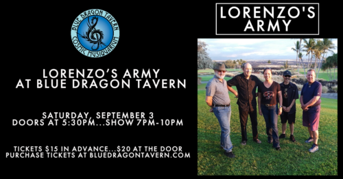 Lorenzo’s Army has been playing music on the Big Island for almost 20 years at well-known local hot-spots, jazz clubs, and private events. This 5-piece band specializes in “good time music for the masses” covering everything from Etta James to Bruno Mars with strong grooves and powerful harmonies. Tickets are $15 in advance…$20 at the door (children 12 and under are free). Doors at 5:30pm…show 7pm-10pm. Purchase tickets at https://www.simpletix.com/e/lorenzos-army-at-blue-dragon-tavern-ticket-113553
