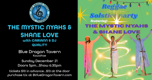 The Mystic Nyahs & Shane Love are one of the most electrifying acts coming out of the Big Island. Combining classic reggae foundations and a soaring new sound, this crew will keep you moving, grooving and singing along with their multi-generational sound. With tracks covering funky, futuristic sounds like “Time Warp” to stirring and uplifting anthems like “Solutions” and “Naturally Nomadic”, they’ll be bringing powerful and fun vibrations all night long. Backed by DJ Quality, a veteran selector, this is sure to be a sound you’ll remember. There will be an opening set by talented vocalist, Cariann, who has graced the Blue Dragon stage on open mic nights.