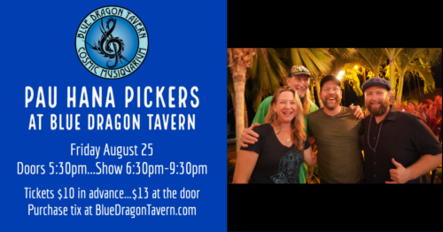 The Pau Hana Pickers bring their special brand of Americana, folk rock and country to the Blue Dragon for a good ole foot stompin’ time! Featuring Jonathan Brooke on guitar/vocals, Delphina on upright bass/vocals, Jeff Quin on fiddle, and Ethan Freedlund on drums.