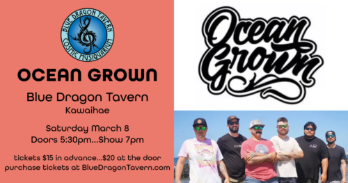 Come join us for Ocean Grown’s debut performance at the Blue Dragon. Doors at 5:30pm…show 7pm. Tickets are $15 in advance…$20 at the door (children 12 and under are free). Purchase tickets here.