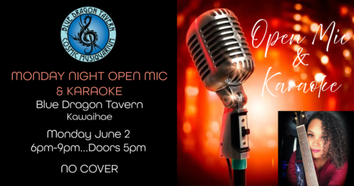 Come on down to the Blue Dragon on Monday, June 2 for Open Mic & Karaoke Night with host Rachael Scott. Come share your musical/vocal talents on our stage with a professional sound and lighting system in a beautiful open-air venue! We love original music at the Blue Dragon and encourage all our musical friends to come out and share their songs and talents…or share your fave cover song…or maybe karaoke is your thing? We love it all! Even if youʻre not musically inclined, come enjoy some of the Big Islandʻs many talented musicians and singers…you never know whoʻs going to show up! Enjoy our craft bar with a variety of local brews and a special menu featuring Blaine Duque.