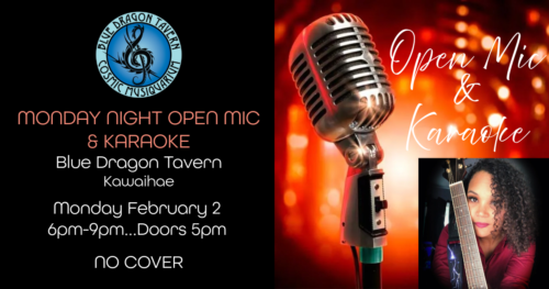 Come on down to the Blue Dragon on Monday, February 2 (and the first Monday of every month) for Open Mic & Karaoke Night with host Rachael Scott.