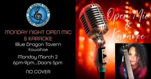 Come on down to the Blue Dragon on Monday, March 2 (and the first Monday of every month) for Open Mic & Karaoke Night with host Rachael Scott.
