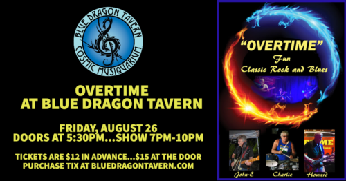 $12Overtime is a 3-piece classic rock and blues band based out of Kona that will keep the dance floor rockin’ all night! Doors at 5:30pm…show 7pm-10pm. Tickets are $12 in advance and $15 at the door (children 12 and under are free). Purchase tix at https://www.simpletix.com/e/overtime-at-blue-dragon-tavern-tickets-112976