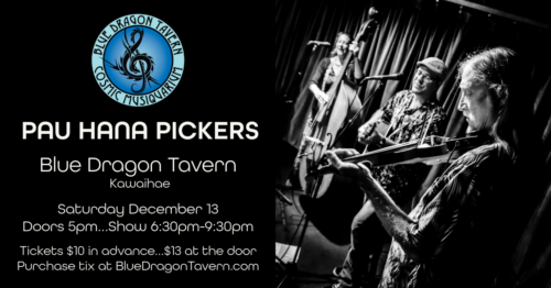 The Pau Hana Pickers bring their special brand of Americana, folk, rock and country to the Blue Dragon for a good ole foot stompin’ time! The band features Jonathan Brooke on guitar/vocals, Jeff Quin on fiddle, and Delphina on upright bass/vocals.