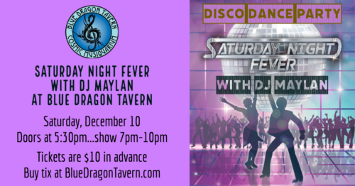 It’s time to boogie as Blue Dragon Tavern presents Saturday Night Fever with DJ Maylan! Bump and hustle to the music of the 70s disco era…with some updated versions and remixes thrown in for good measure. Don’t forget to dig out those spandex pants, wide collar shirts and platform shoes for a chance to win a $100 gift certificate for the best 70s disco costume…mirror ball included!