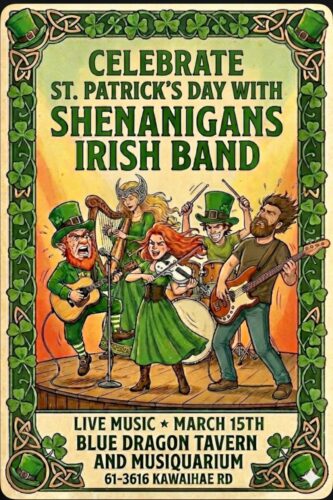Shenanigans Irish Band gets you in the spirit , ready for St. Patrick’s day! They will be playing many traditional Irish tunes as well as some of the more energetic rebel songs…Bring your old felt hat and your dancing shoes!