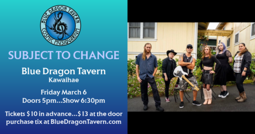 Subject to Change is a six-piece rock band hailing from all over the Big Island of Hawaii. Specializing in reimagined renditions of smash hits from the 80s, 90s, and 2000s, and a splash of originals. No matter what age you are or what background you come from, Subject to Change will have you dancing in no time.