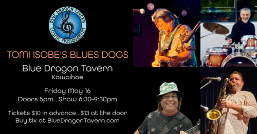 Tomi Isobe is a dynamic blues guitarist and showman who has performed for over 40 years in Tokyo, Boston, Georgia, and Hawaii. Though the blues is his first love, Tomi plays a wide variety of music, .including rock, R&B, and funk…covering artists like Santana, Stevie Wonder and Stevie Ray Vaughn, as well as blues artists like BB King, Muddy Waters and T-Bone Walker. Tomi will be joined by the Blues Dogs featuring Ashley Harding on sax, Doug Espejo on bass, and Felix Guerra on drums.