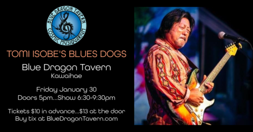 Tomi Isobe is a dynamic blues guitarist and showman who has performed for over 40 years in Tokyo, Boston, Georgia, and Hawaii. Though the blues is his first love, Tomi plays a wide variety of music, .including rock, R&B, and funk…covering artists like Santana, Stevie Wonder and Stevie Ray Vaughn, as well as blues artists like BB King, Muddy Waters and T-Bone Walker. Tomi will be joined by the Blues Dogs featuring Ashley Harding on sax, Doug Espejo on bass, and Russell Lundgren on drums.