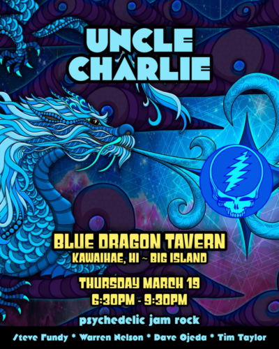 Psychedelic jam band Uncle Charlie performs at the Blue Dragon Tavern on Thursday, March 19. Featuring the music of the Grateful Dead, Allman Brothers, Stones, Beatles and more. Known for their mind-bending improvisational jams, every show promises to be a unique experience. The band features Steve Fundy on guitar, Warren Nelson on keys, Dave Ojeda on bass, and Tim Taylor on drums.