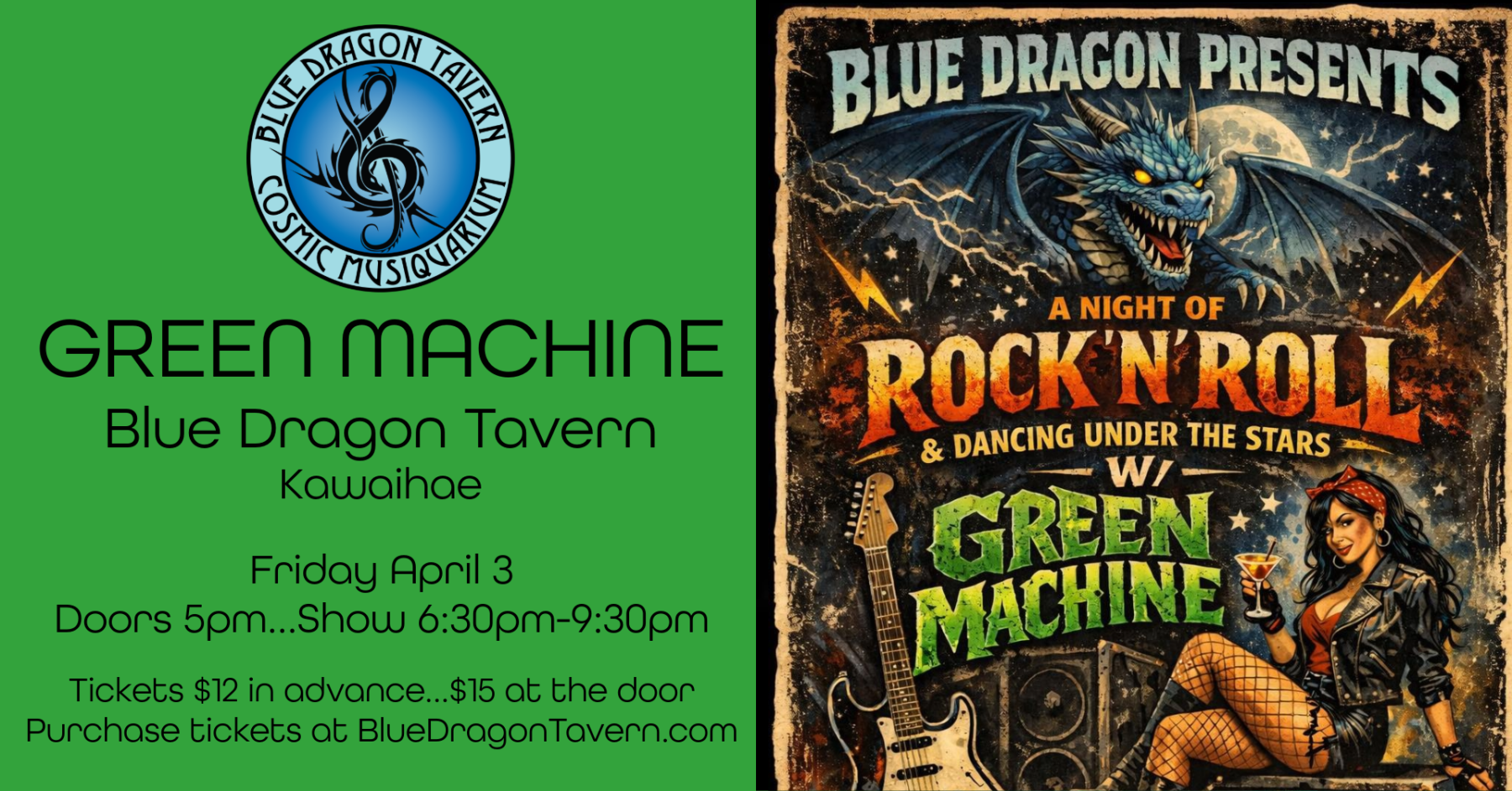 Doors at 5pm…Show 6:30pm. Tickets are $25 in advance…$30 at the door (children 12 & under are free). The guest chef for this show is Fish with Cool Runnings Jamaican Food Truck. Visit BlueDragonTavern.com for menu options.