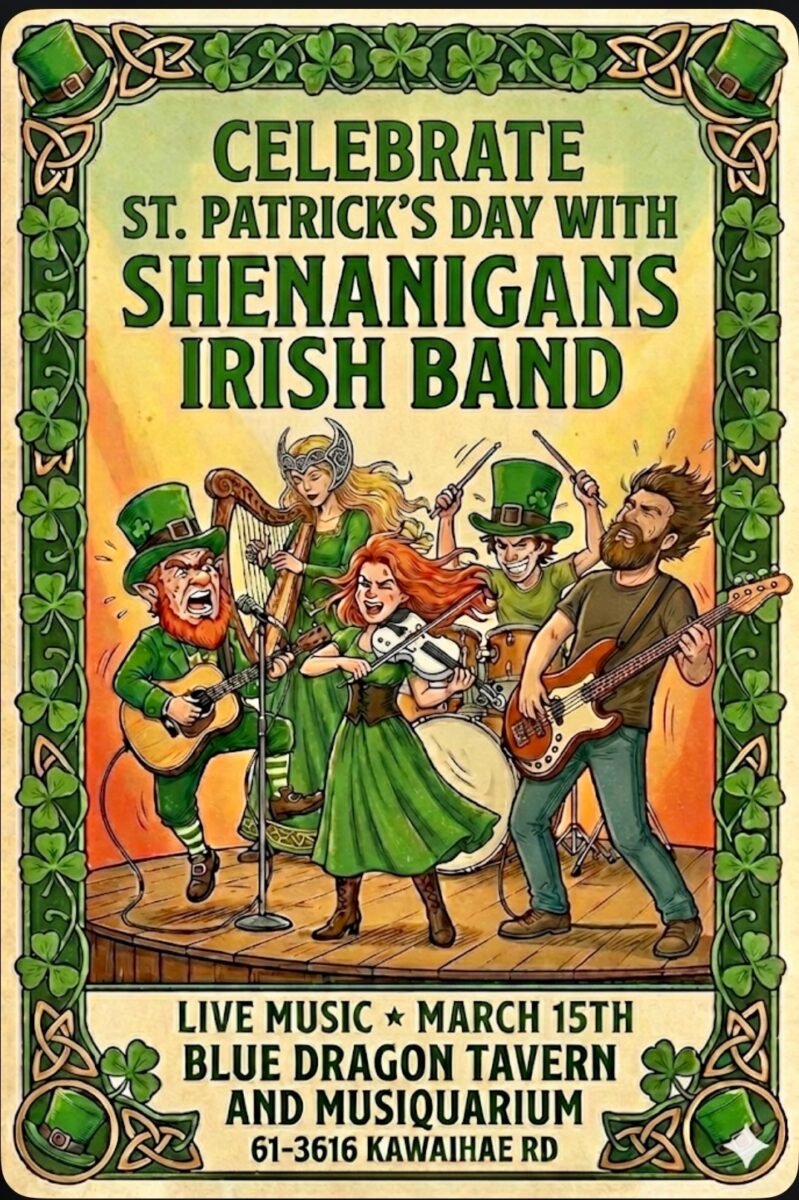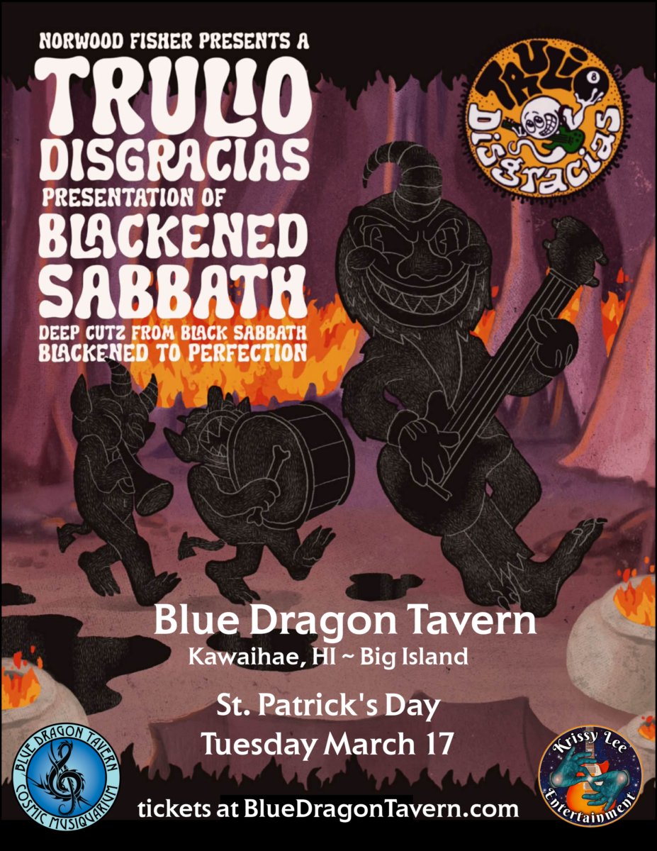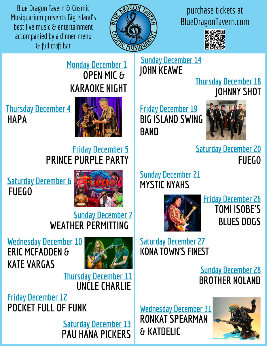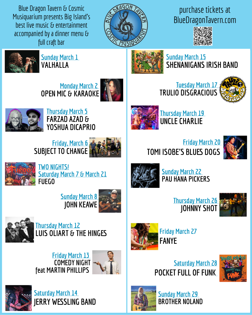 The Pau Hana Pickers bring their special brand of Americana, folk, rock and country to the Blue Dragon for a good ole foot stompin’ time! The band features Jonathan Brooke on guitar/vocals, Jeff Quin on fiddle, and Delphina on upright bass/vocals.