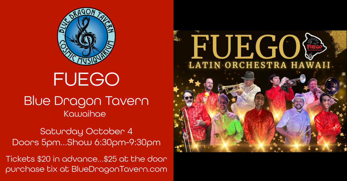 This dynamic Orchestra is ready to vibrate energetically and generate an unforgettable night for everyone, together with El Ritmo, El Sabor y toda La Candela of our beloved Latin music. Fuego Latin Orchestra Hawaii is bringing the heat to this incredible location. Get ready to dance the night away to the infectious sounds of salsa, cumbia, bachata, merengue and more! Boasting a BIG DANCE FLOOR, open air seating, food, drink, and AMAZING MUSIC by the Big Island’s Hottest Latin group!
