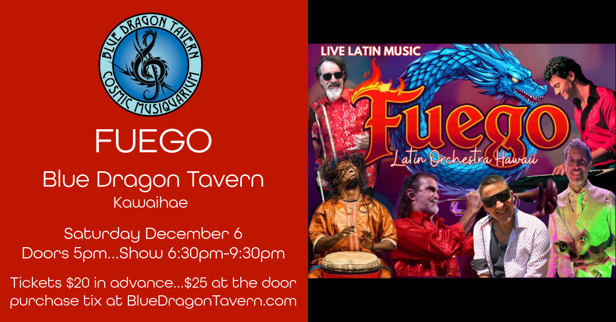 FUEGO LATIN ORCHESTRA HAWAII will be bringing the heat to the stage for all your grooving needs! FUEGO is the Big Island’s most dynamic musical group. Creating unforgettable moments of rhythm and fun on the dance floor for all levels of dancers with their versatile musicality, this collection of passionate musicians are dedicated to keeping Latin music alive! Fuego’s team is dynamic and on point with their interpretations of all the most popular Latin hits, timeless classics and innovative originals. Fuego will have you moving even in your seat from the minute they drop the first note.