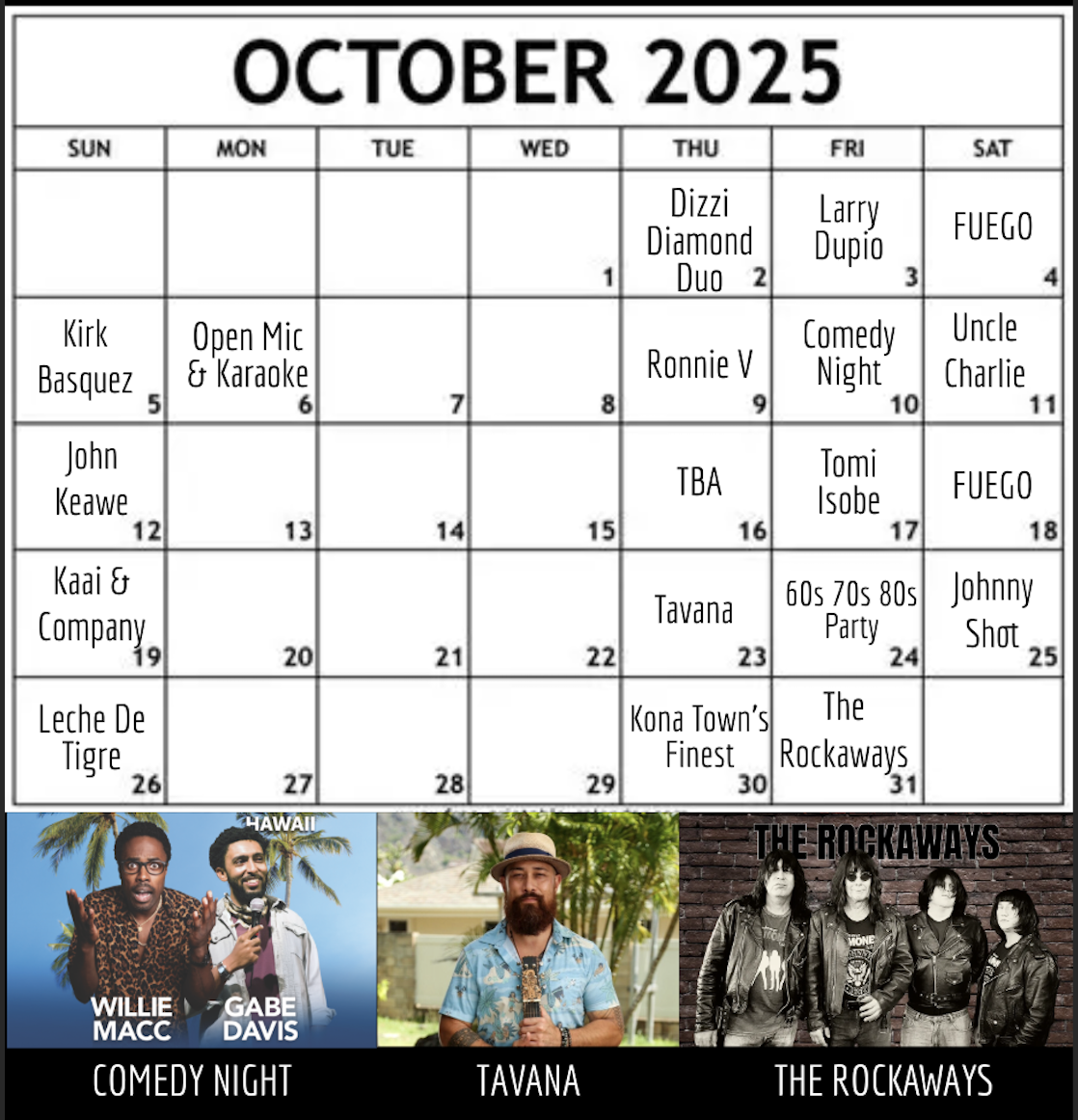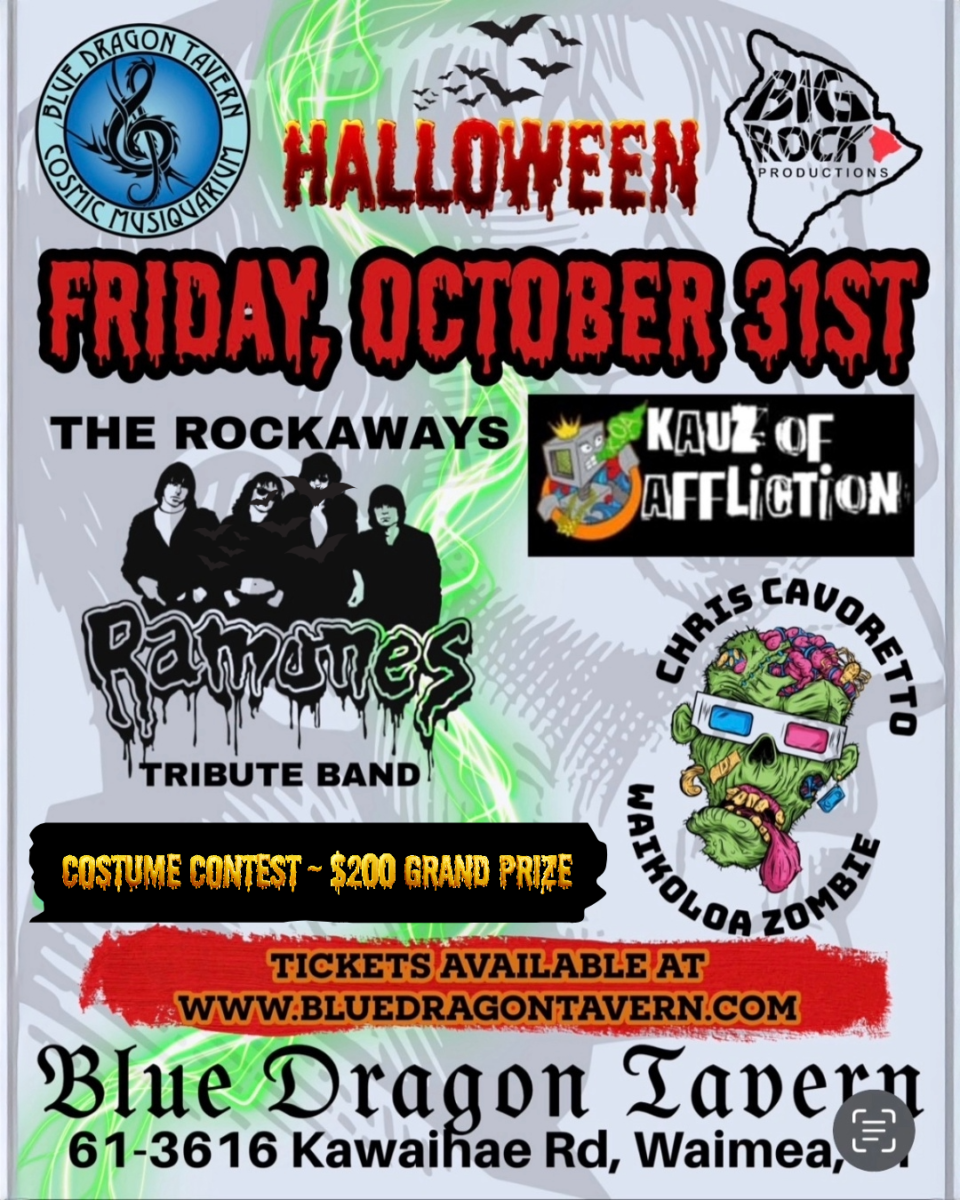 Join us for some Halloween fun with The Rockaways – Ramones Tribute Band, with Kauz of Affliction and Chris Cavoretto – Waikoloa Zombie. Plus a Costume Contest with $200 Grand Prize and more prizes and swag! Doors 5pm…Show 6pm. Tickets are $25 in advance…$30 at the door.
