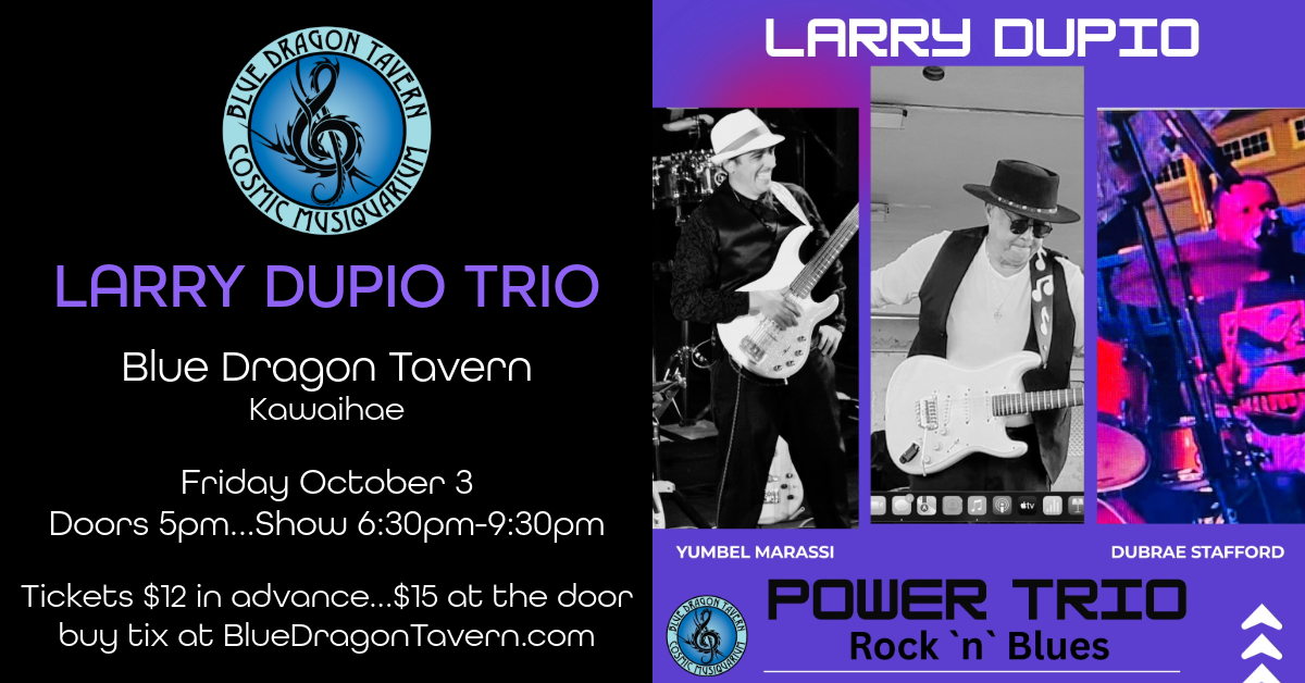 Inspired by Blues Masters like Muddy Waters, John Lee Hooker, Albert King, Roy Buchanan and Jimi Hendrix, Larry emerges to the forefront with a musical style all his own. Lightning Larry Dupio is a Two-Time Na Hoku Hanohano Award Winner and won Hawaii’s support in the genre for “Rock Album of the Year.” He is also an award winning Blues Guitarist. “Lightning Strikes Hilo” won in 2018 and “Love and Lightning” won in 2020. In Hawaii, Larry had the awesome opportunity to play music alongside these giants in the industry ~ Charlie Musselwhite, Canned Heat, John Mayall, Davy Jones, Johnny Lang, Jesse Colin Young, Commander Cody, Ziggy Marley, David Lindley, Radiators, Jimmy Cliff, Mick Fleetwood and Willie K.
