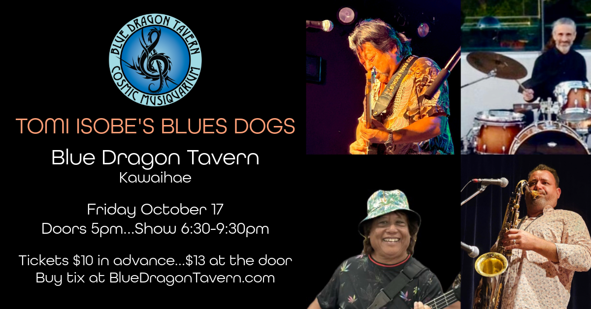 Tomi Isobe is a dynamic blues guitarist and showman who has performed for over 40 years in Tokyo, Boston, Georgia, and Hawaii. Though the blues is his first love, Tomi plays a wide variety of music, .including rock, R&B, and funk…covering artists like Santana, Stevie Wonder and Stevie Ray Vaughn, as well as blues artists like BB King, Muddy Waters and T-Bone Walker. Tomi will be joined by the Blues Dogs featuring Ashley Harding on sax, Doug Espejo on bass, and Felix Guerra on drums.