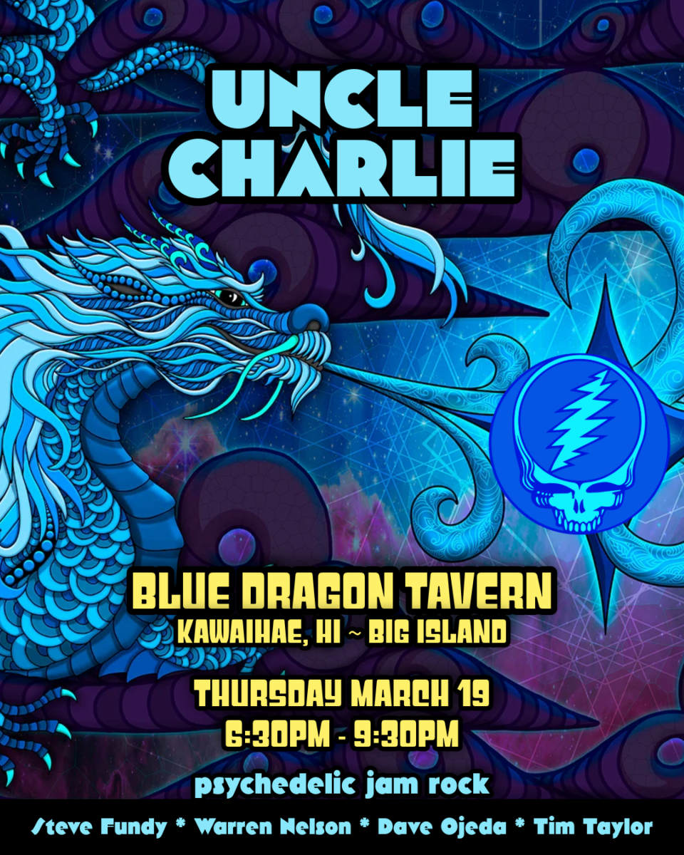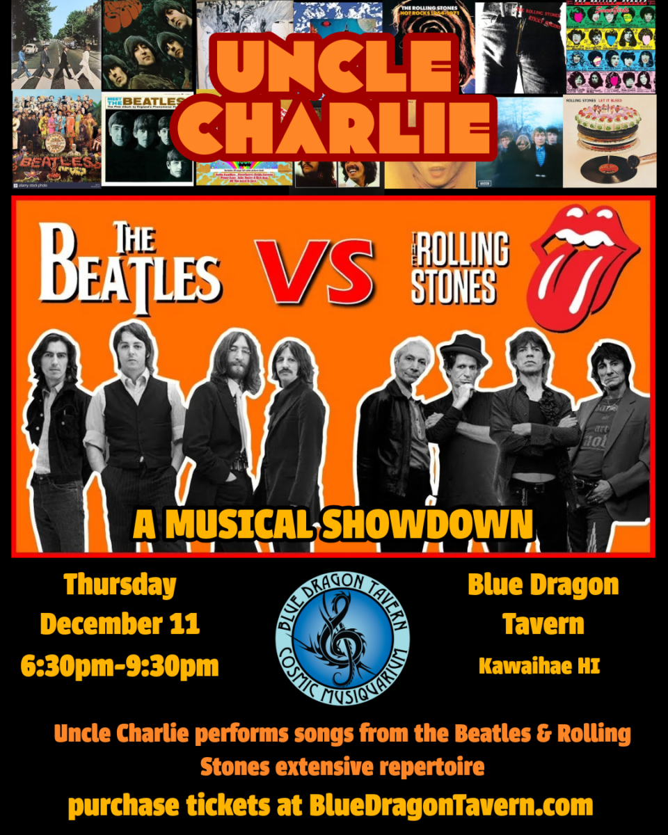 Psychedelic rock band Uncle Charlie and the Blue Dragon Tavern presents The Beatles vs. Rolling Stones…a classic rivalry of two of the most iconic bands in rock n’ roll history! Uncle Charlie will be performing selections from both of these legendary bands in their own inimitable style…in other words, psychedelic jams and segues will be in abundance! But it will be up to you, the audience, to decide the winner of this “Battle of the Bands”! Don’t worry, Uncle Charlie will be performing a 2nd set of Grateful Dead for all of our Deadhead friends!