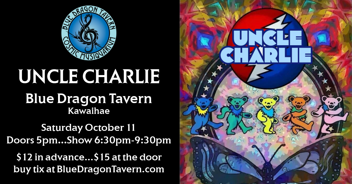 Psychedelic rock band Uncle Charlie brings the jams to Blue Dragon Tavern on Saturday, October 11. Known for their mind-bending improvisational jams, every show promises to be a unique experience. Uncle Charlie breathes new life into the music of the Grateful Dead, Beatles, Stones, and more…putting their own unique spin on the songs. The band features Steve Fundy on guitar, Warren Nelson on keys, Dave Ojeda on bass, and Tim Taylor on drums.