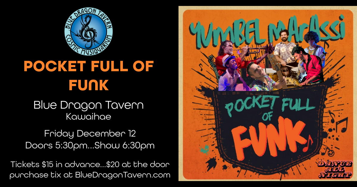 Get ready for a night of original funk like you’ve never heard before! Yumbel Marassi proudly presents his new project, Pocket Full of Funk, making its debut at Blue Dragon.